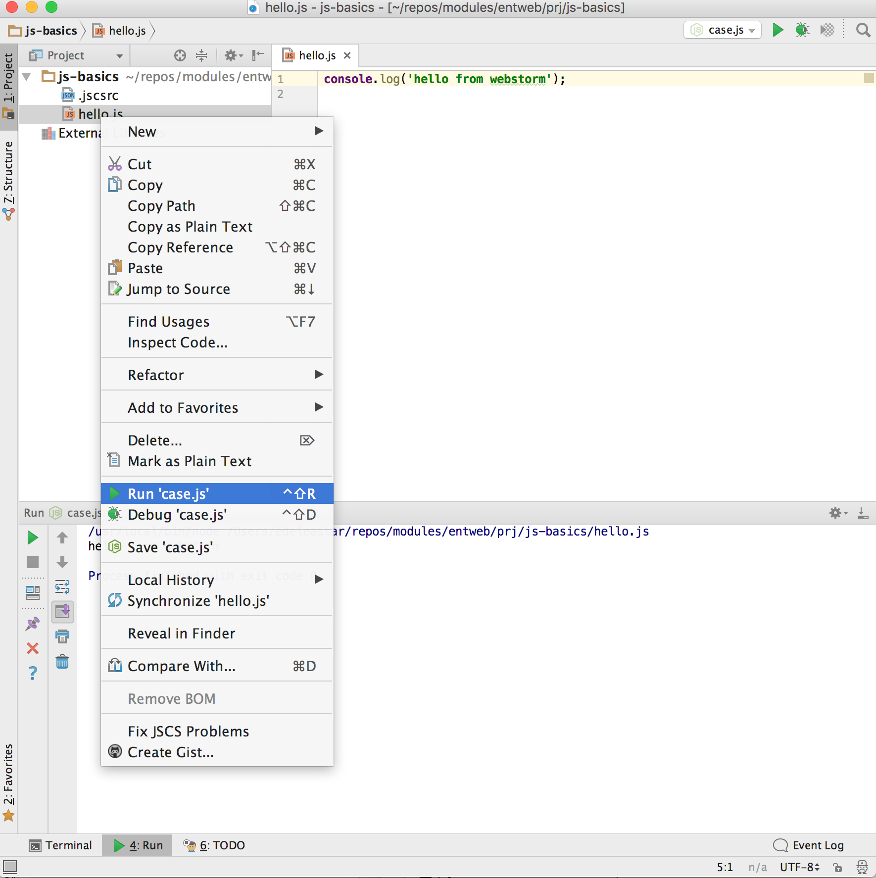Create a new empty project called js-basics. Follow the instructions on the first step of the last lab to configure the project with the same .jscsrc configuration as outlined there.