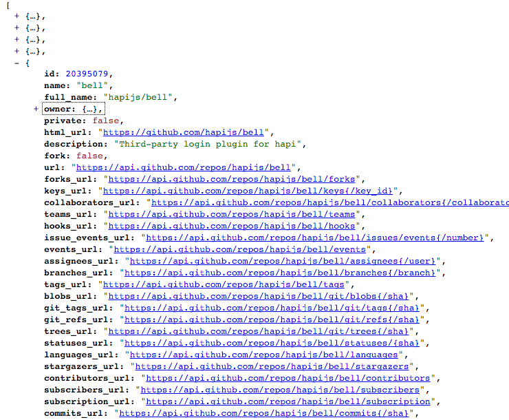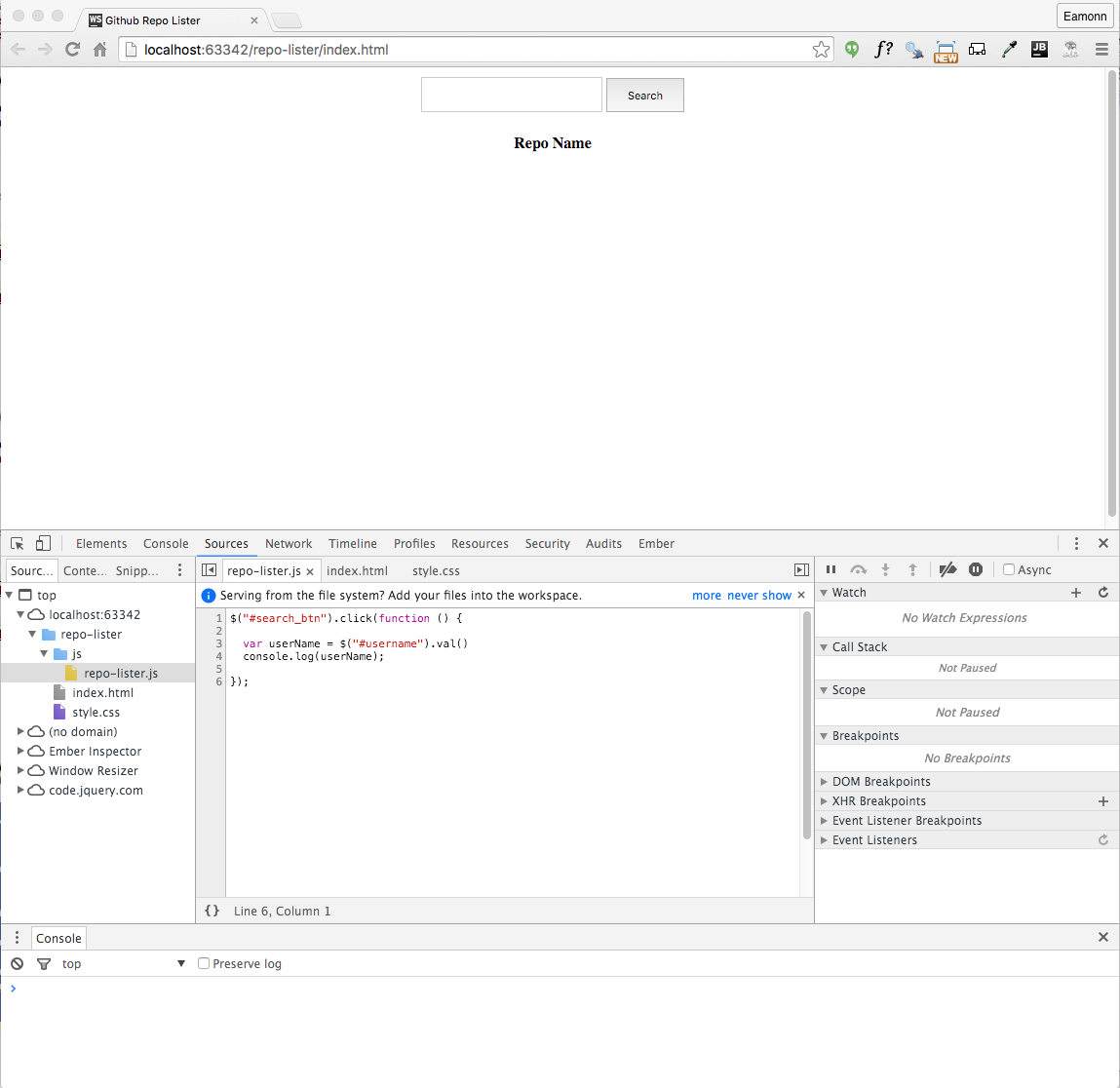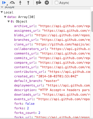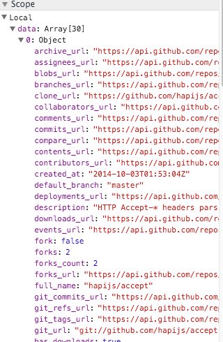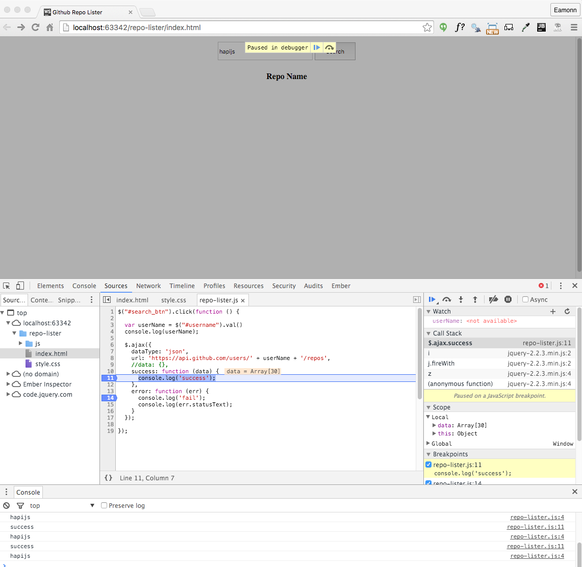 We can extend the success function to list the repo names to the console: