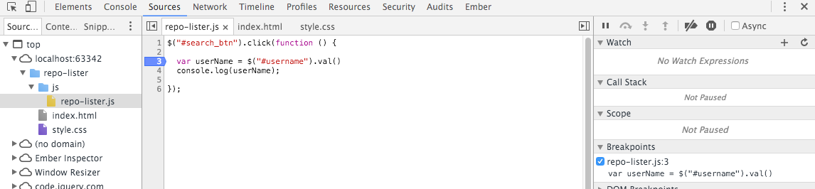 Browse to index.html now, enter a value and press search. You can do this from within WebStorm - as the chrome icon will appear if you leave the mouse rest on the source for a second or two.