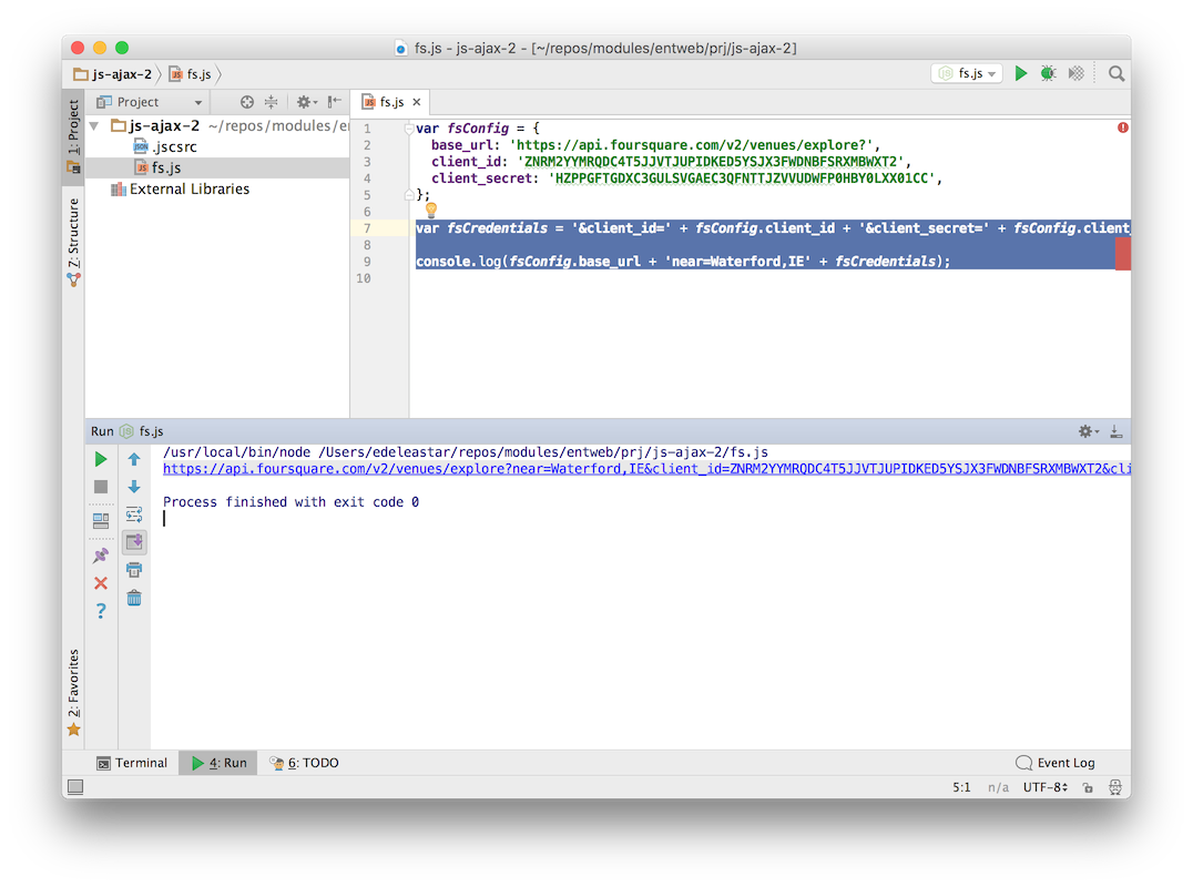 Connect to foursquare API and retrieve list of venues based on a simple location and venue keyboard. Log the venues to the console. Use an npm package to access the api.