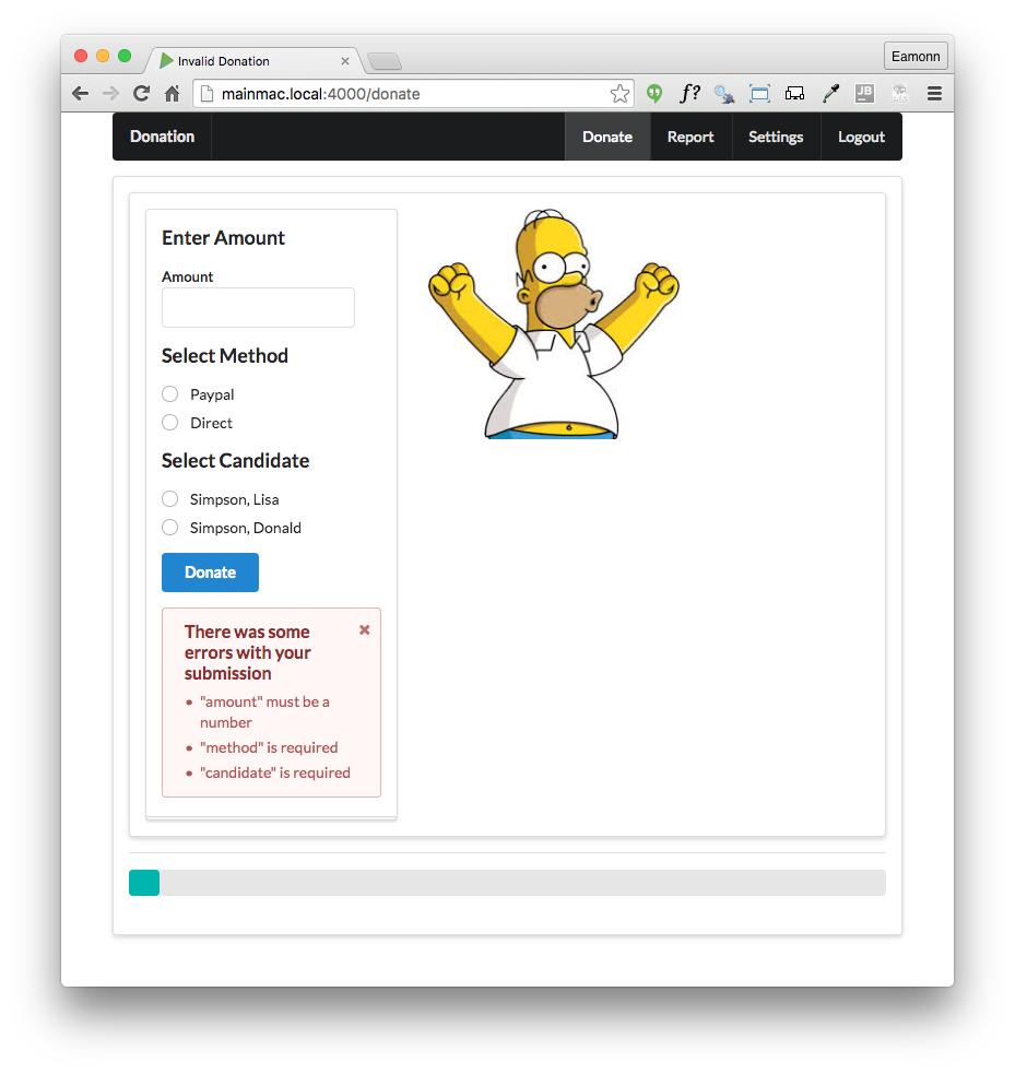 One the home view, we should pass the list of candidates to the view to enable the user to select which candidate to make a donation to: