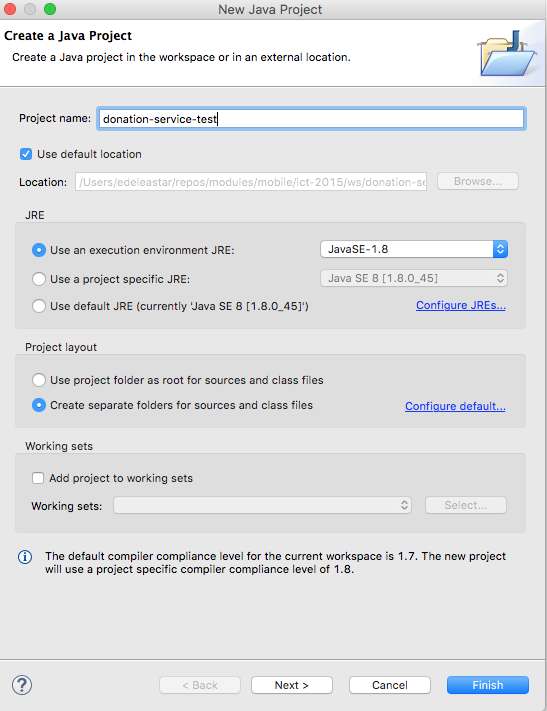Create a new Java Project in eclipse - this time neither a play nor an Android app, just a simple Java Application. Call the Project donation-service-play-test"