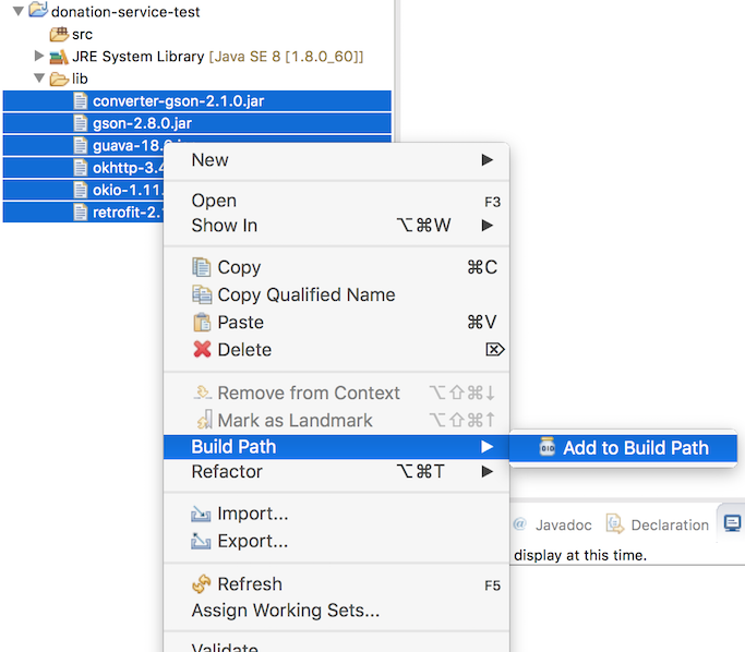 Select all of the imported jar files, right-click, and select 'Build Path->Add to Build Path'